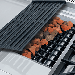 · 2 parrillas superiores en hierro fundido montadas sobre una cubierta semi-sellada.