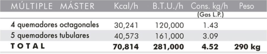 · Plancha Cold rolled steel de 3/4″ de espesor, área útil de: frente: 0.504 m, fondo: 0.560 m.2 quemadores tipo «u» en acero inoxidable.